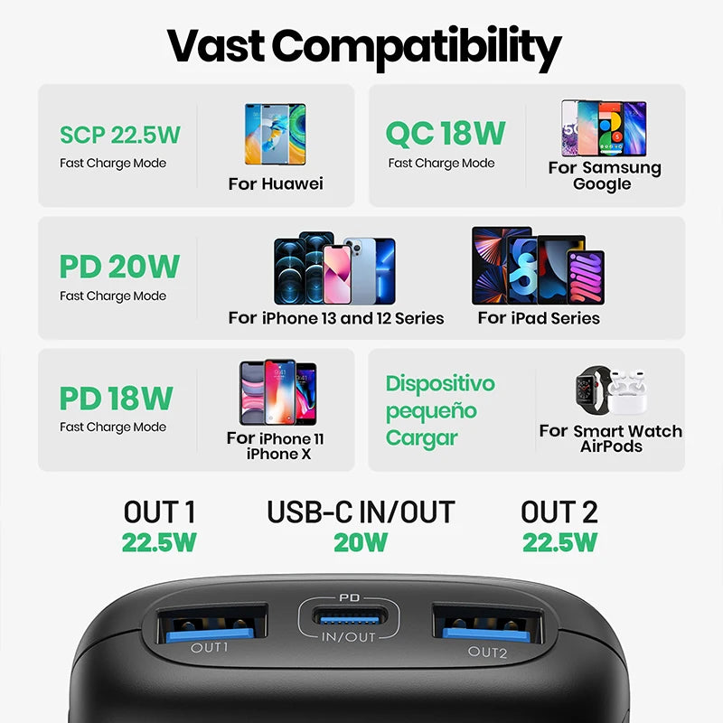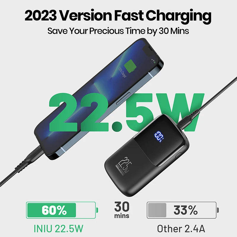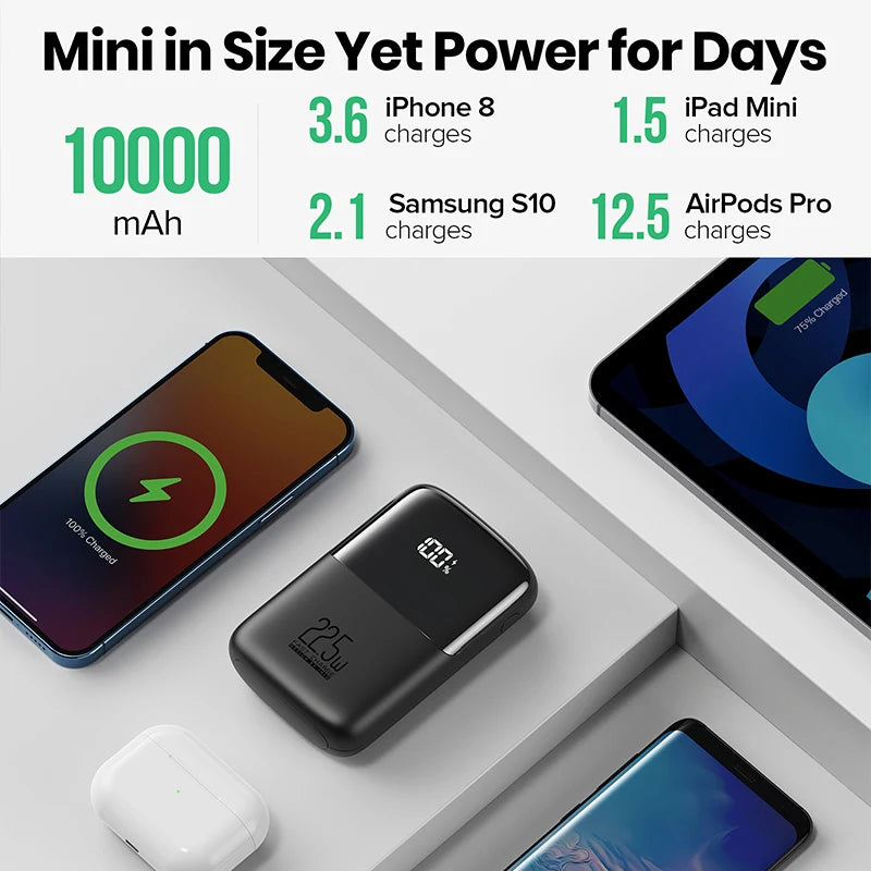 Stay powered anywhere with this ultra-compact 10000mAh fast-charging power bank. Featuring PD 3.0 & QC 4+ technology, it delivers up to 22.5W output to charge your devices at lightning speed—fueling an iPhone from 0% to 60% in just 30 minutes.