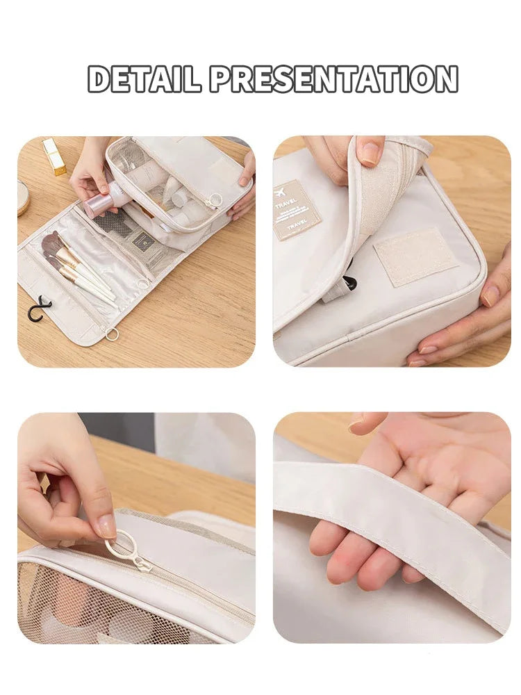 Integrated hanging hook allows you to suspend the bag on bathroom doors, towel racks, or closet bars for quick access—perfect for hotel stays or camping. -