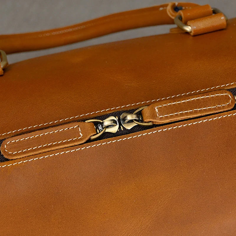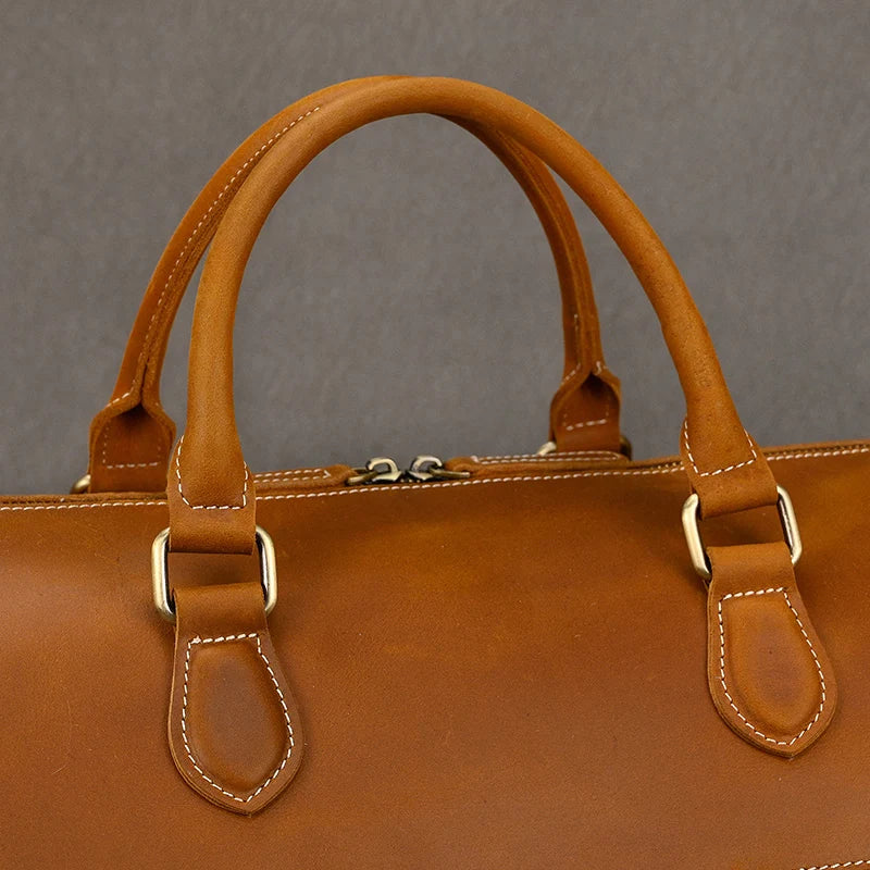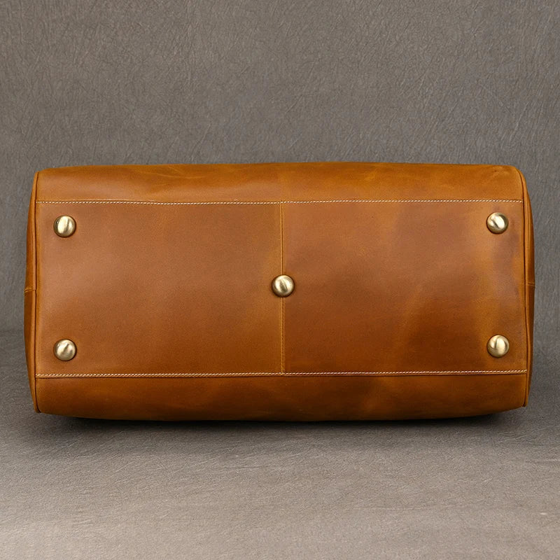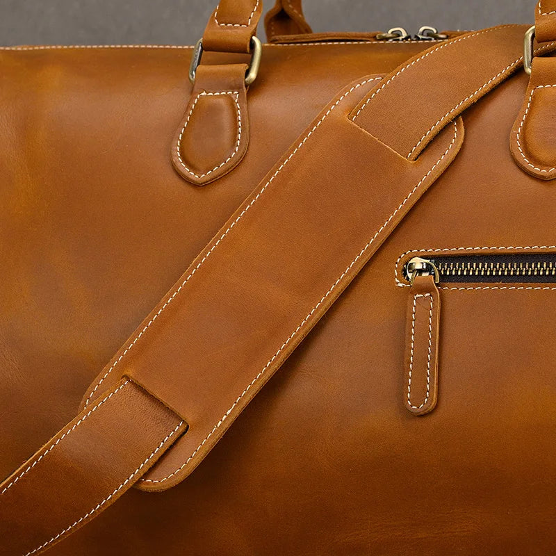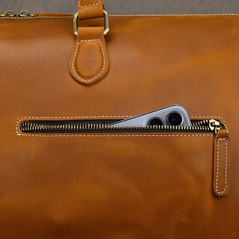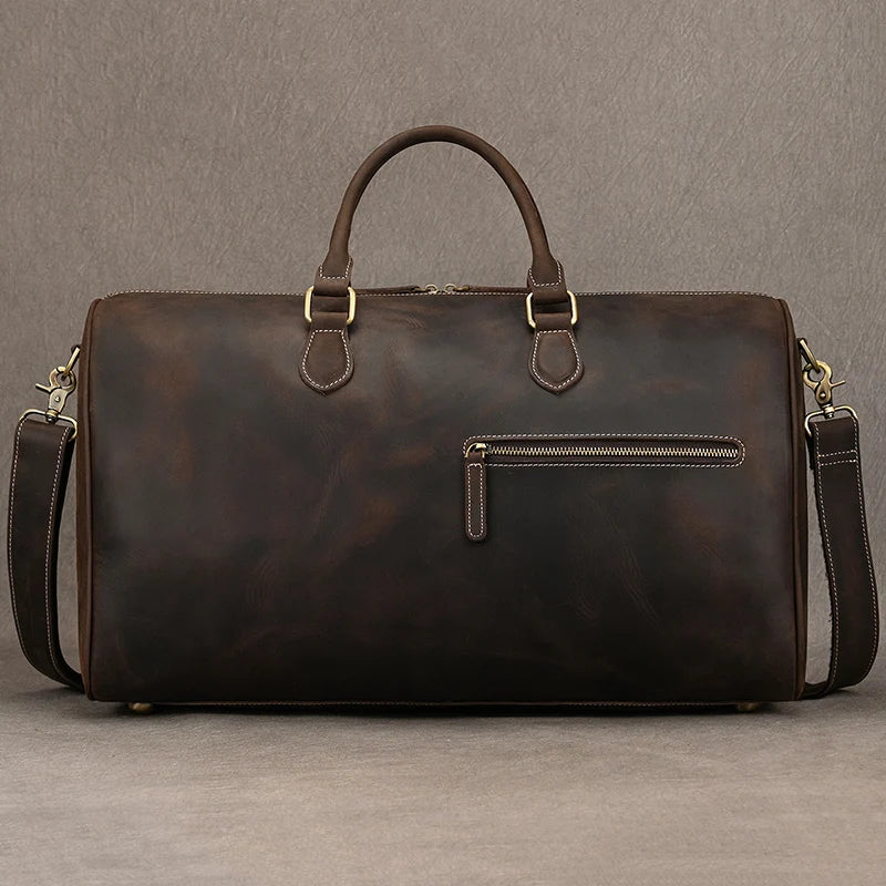 Designed with sturdy handles, an adjustable shoulder strap, and crossbody carry options, this men’s leather bag ensures comfort and versatility on the go. Its spacious interior easily fits clothes, shoes, and travel essentials, while the high-quality leather develops a rich patina over time, enhancing its vintage charm.