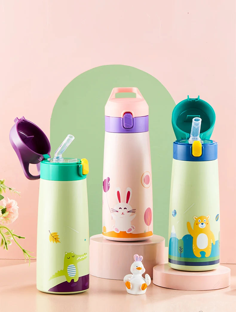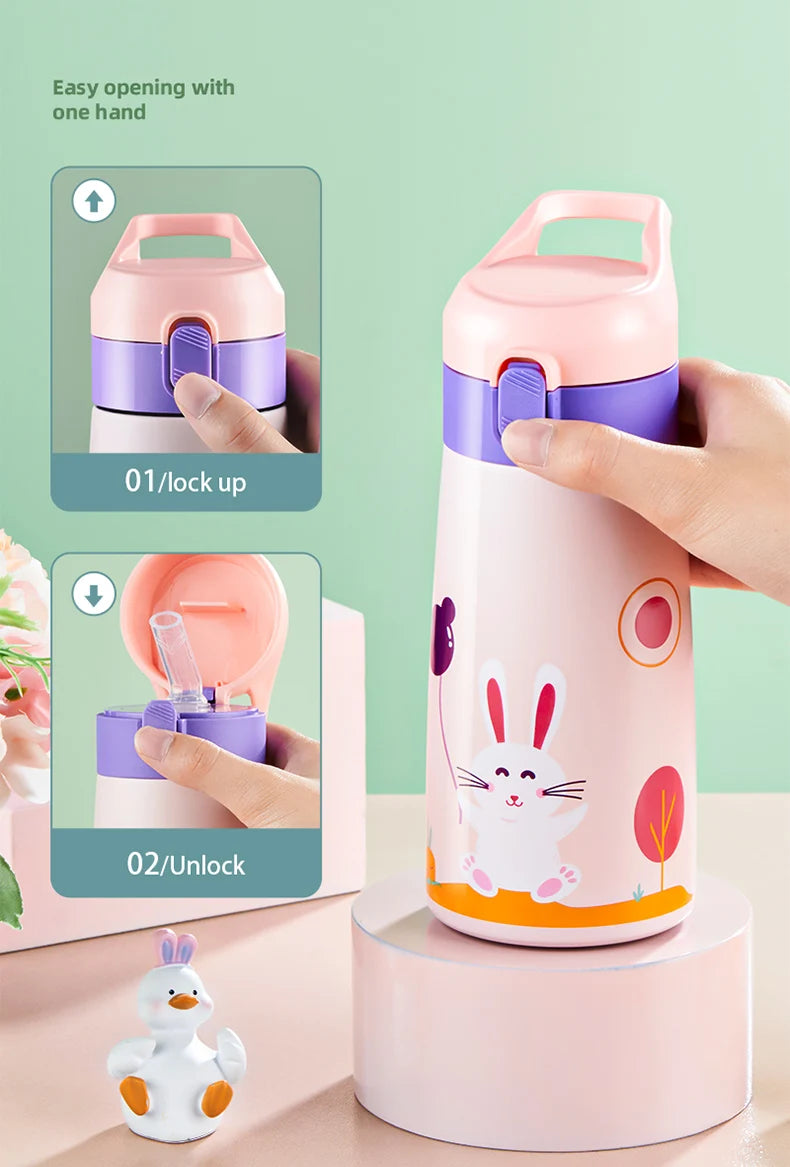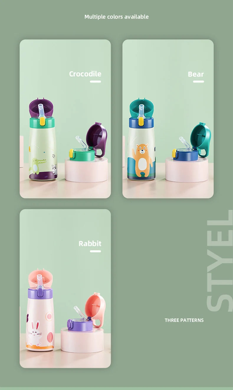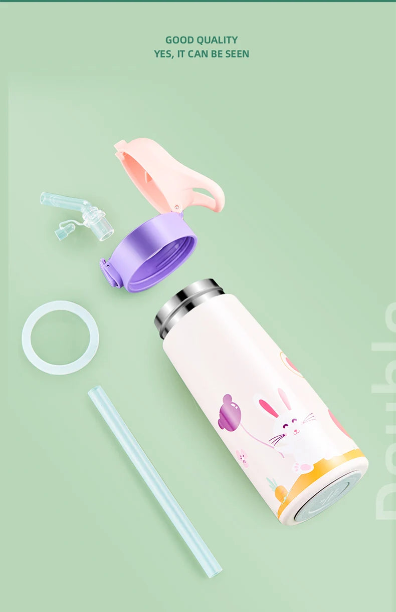 Kids Stainless Steel Straw Thermos Mug with Case – Cartoon Leak-Proof Thermal Water Bottle