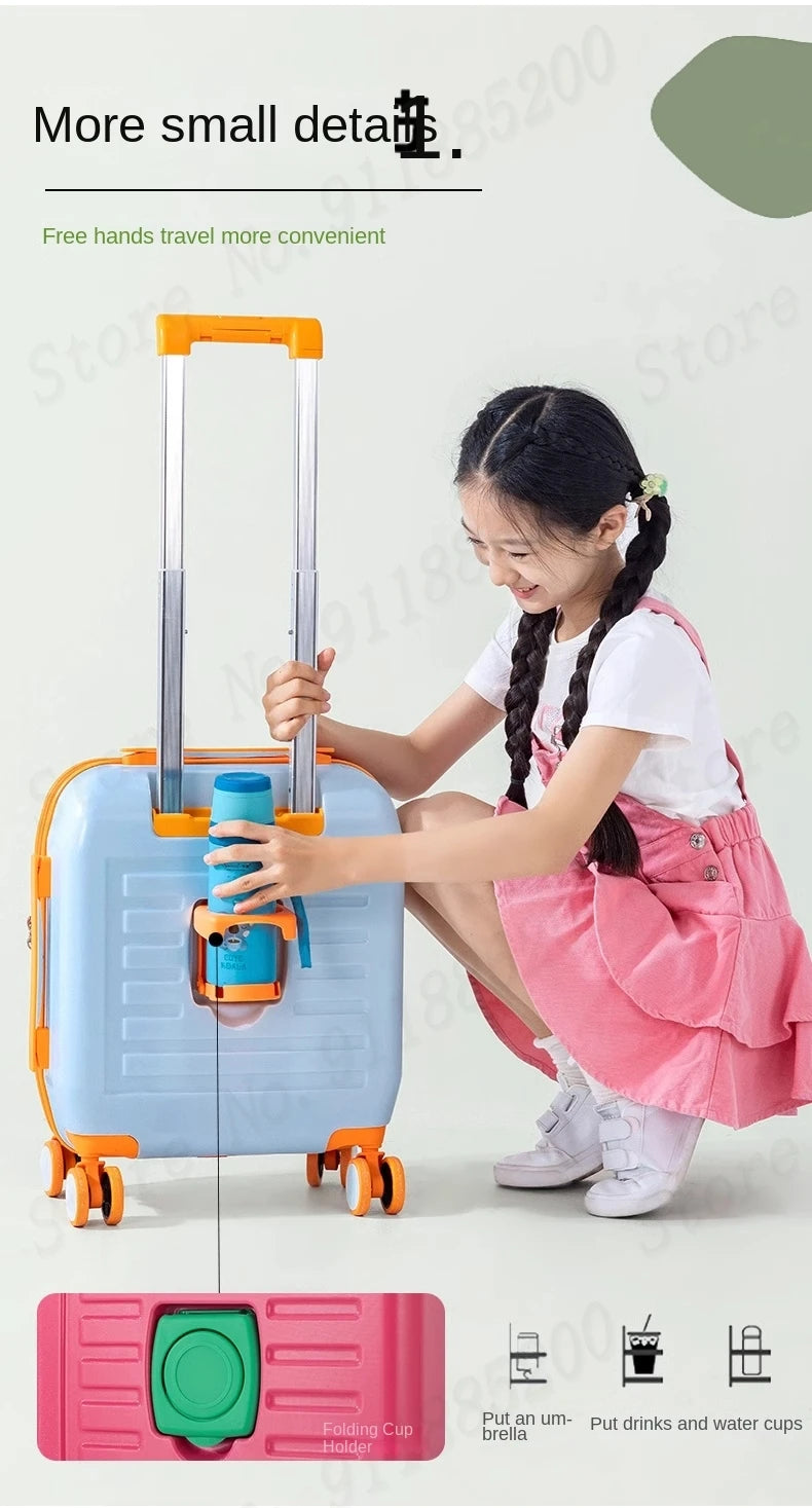 Make travel fun and easy for your little one with this Children’s Cartoon Luggage. Featuring a cute cartoon design and a practical cup holder, this 18-inch boarding box is the perfect size for kids to carry their own essentials on family trips.