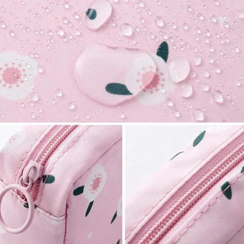 Designed with fun and feminine cartoon patterns, this pouch looks like a cute accessory while keeping your hygiene items private. -
